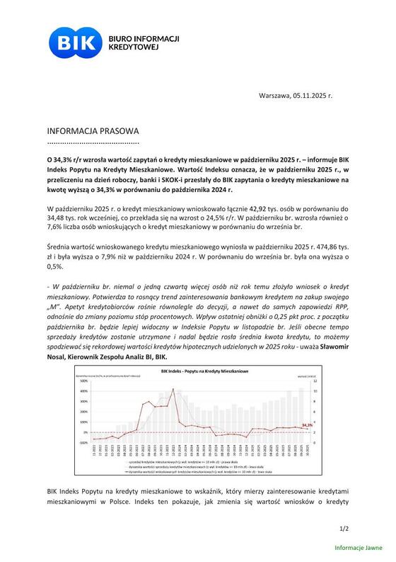 BIK: o 34,3% r/r wzrosła wartość zapytań o kredyty mieszkaniowe w październiku 2025 r.