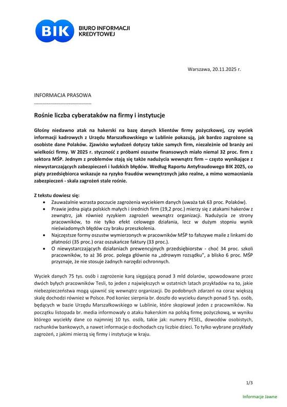 BIK Rośnie liczba cyberataków na firmy i instytucje 20 11 2025