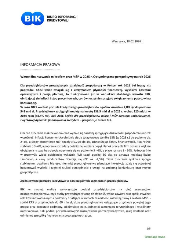 IP_BIK Rynek kredytów dla mikrofirm i MŚP w 2025 i prognozy_2026 02 18